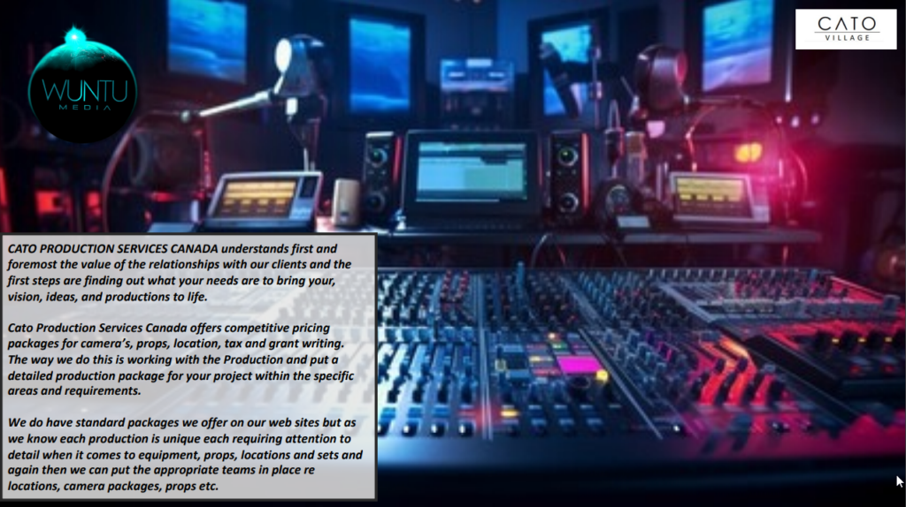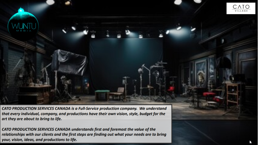 The studio, located in the North Cato Village of Canada, is a visionary space designed to revolutionize the creative industries, education, and sustainable living. This self-contained SMART community integrates education, entertainment, movies, media, music, gaming, medical care, cutting-edge technologies, and renewable energy within a harmonious village setting. It boasts a diverse range of facilities, including housing, filming studios, recording studios, gaming arenas, virtual technology spaces, schools, and medical facilities.